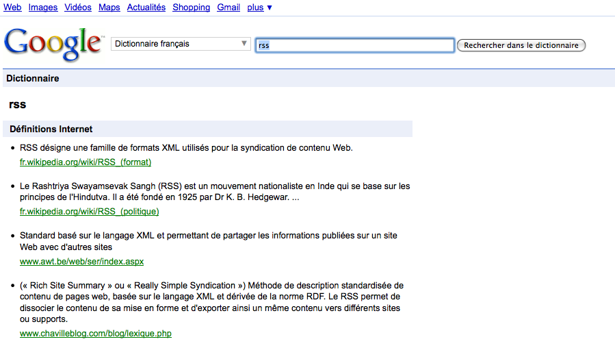 Lors d’une requête sur define:rss par exemple, le moteur lancait une recherche sur le Web et repérait automatiquement les pages de son index comportant plusieurs définitions, parmi celles qui étaient issues de sources telles Wikipédia, ou qui comportaient un terme comme « glossaire », « lexique », dico », etc. dans l’URL. La présentation des résultats était différente de la page traditionnelle.